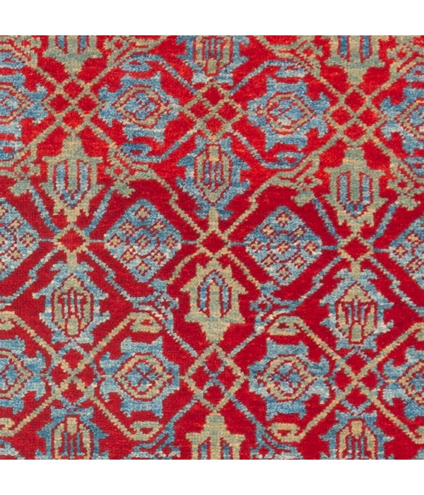 This lattice pattern is composed of palmettes and leaves filling the various compartments against the imposing ground. One has the impression that it is only part of a larger scheme designed 15th-century rug from the Mamluk era, Cairo region, Eygpt. These designs have often been described as wagirehs or samplers and were said to have been used as weaver`s aids, or for demonstration purposes, made as a template or pattern for the carpet design and production of larger rugs, they are generally small pieces the size of a scatter rug or mat. Mamluk carpets originated in a physical environment that lacked the combination of abundant marginal grazing land and a temperate climate with cool winters that were common to most carpet-weaving areas in the Islamic world. While related to a broader tradition of Turkish weaving centered in Anatolia, far to the north, the designs of these carpets include atypical elements, such as stylized papyrus plants, that are deeply rooted in Egyptian tradition. Their unusual composition and layout probably represent an attempt to develop a distinctive product that could in effect establish a โMamluk brandโ in the lucrative European export market. The uncharacteristic color schemeโdevoid of the undyed white pile and employing a limited range of three or five hues in much the same valueโalso suggests a conscious attempt to create a particular stylistic identity. Also virtually unique in the world of Islamic carpets is the S-spun wool. It has been argued that the tradition of clockwise wool spinning originated in Egypt because of the earlier Egyptian tradition of spinning flax into linen thread. Details of the plantโs botanical structure make it impossible to spin flax fiber in the more common counterclockwise direction utilized throughout the Middle East for wool and cotton.Mamluk carpets with the color combinations seen in the Simonetti are now generally accepted as part of an earlier tradition that has many links to the weaving of Anatolia, Iran, and Syria. The โthree-colorโ Mamluk carpets, well represented in the Metropolitanโs collection, represent a later development that continued well after the Ottoman conquest of Egypt in 1517. Many such carpets may have been produced well into the seventeenth century, and possibly even later. (Walter B. Denny in [Ekhtiar, Soucek, Canby, and Haidar 2011]). The design of the rug is interpreted by our designers from our Mamlouk-type rugs collection and vivid colors are used for this rug.