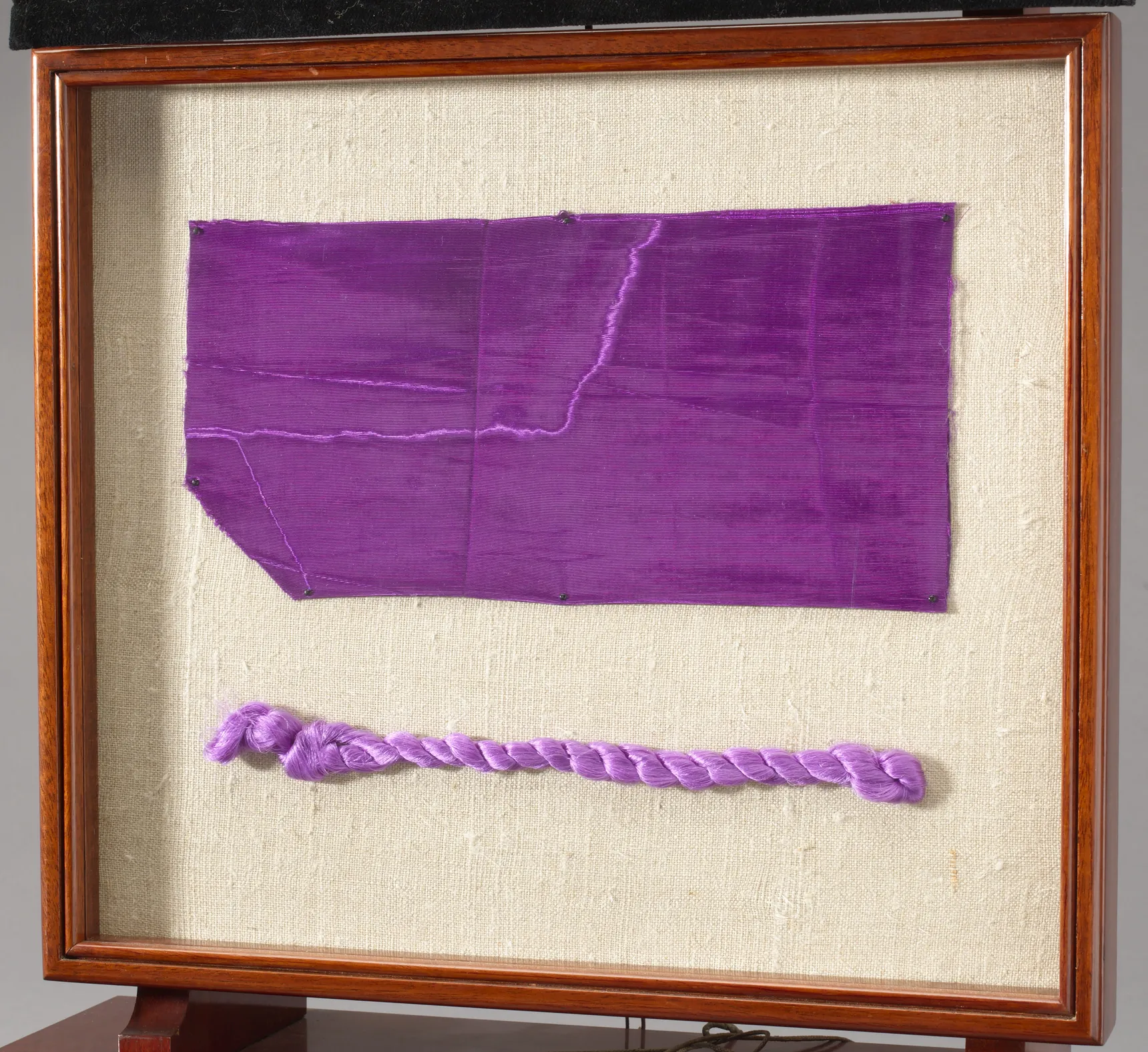 A length of dress fabric and a silk skein dyed with mauveine were mounted in a wooden frame.
