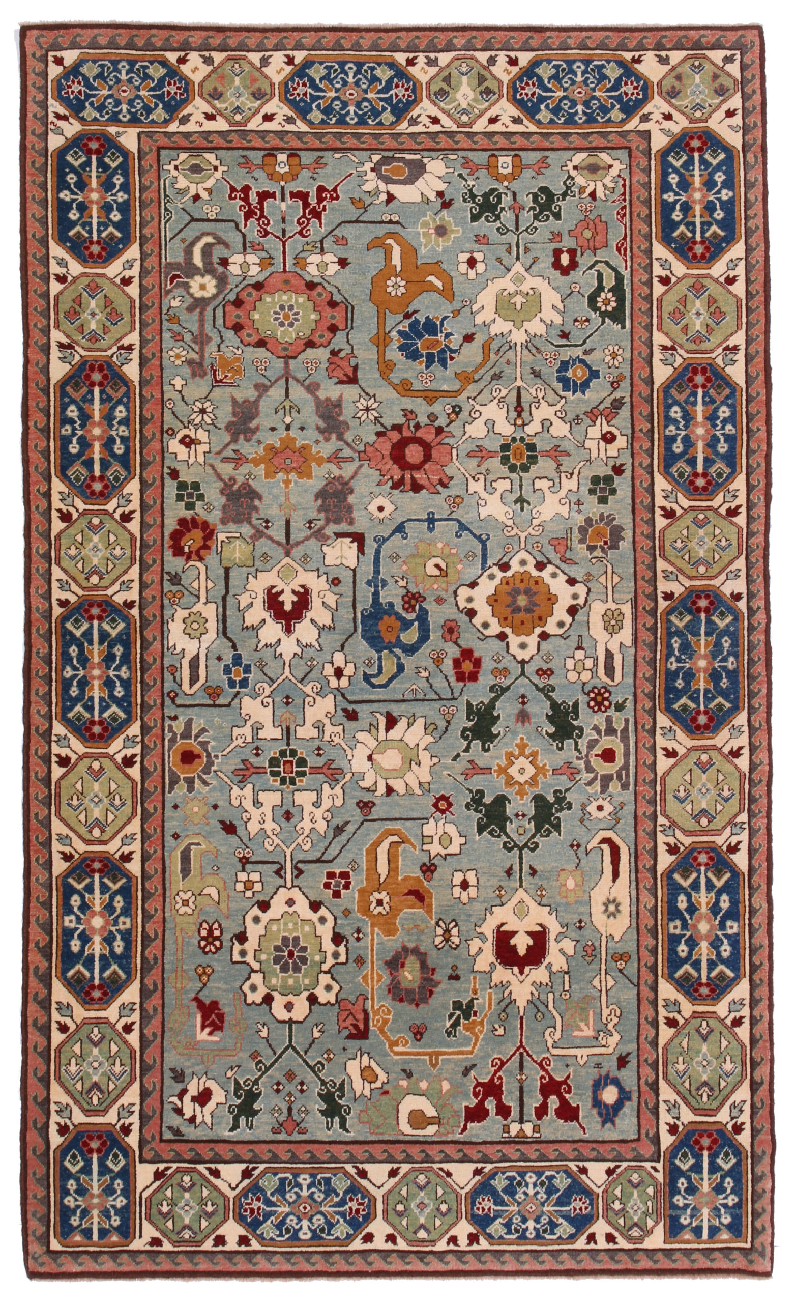 The source of the rug comes from the book Antique Rugs of Kurdistan A Historical Legacy of Woven Art, James D. Burns, 2002 nr.40. This offset pattern is composed of palmettes and stems with large forked leaves, one has the impression that it is only part of a larger scheme designed 17th-century rug from Sa'luj Bulagh, Eastern Kurdistan area. Very similar palmettes, drawn in a curvilinear manner and combined with identical forked leaves, can be seen on a few examples of workshop carpets made from the late seventeenth century onward in Herat in Khurasan province, east Persia, and the same pattern known as Harshang design was used in the Caucasus in the eighteenth century, as well. The design of this rug is interpreted by our designers and soft colors are chosen for this rug.