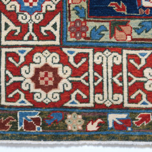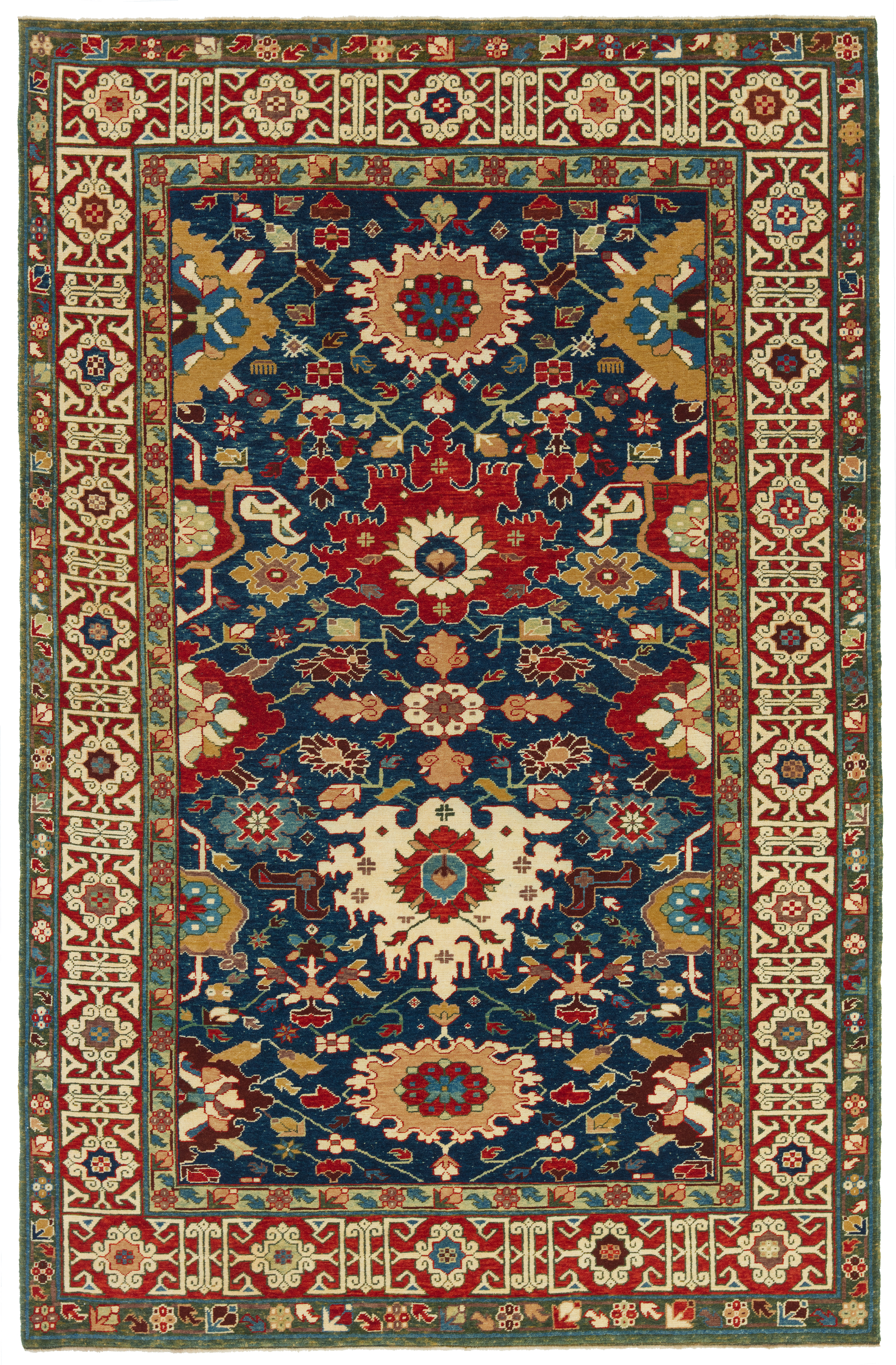 The source of the rug comes from the book Orient Star - A Carpet Collection, E. Heinrich Kirchheim, Hali Publications Ltd, 1993 nr.79. This is an unusual design of 18th or 19th-century rug from Khila, Kuba region East Caucasus area. Very similar palmettes, drawn in a curvilinear manner and combined with identical forked leaves, can be seen on a few examples of workshop carpets made from the late seventeenth century onward in Herat in Khurasan province, east Persia, and the same pattern known as Harshang design was used in the Caucasus in the eighteenth century, as well. The design of this rug is interpreted and vivid colors are chosen for this rug.