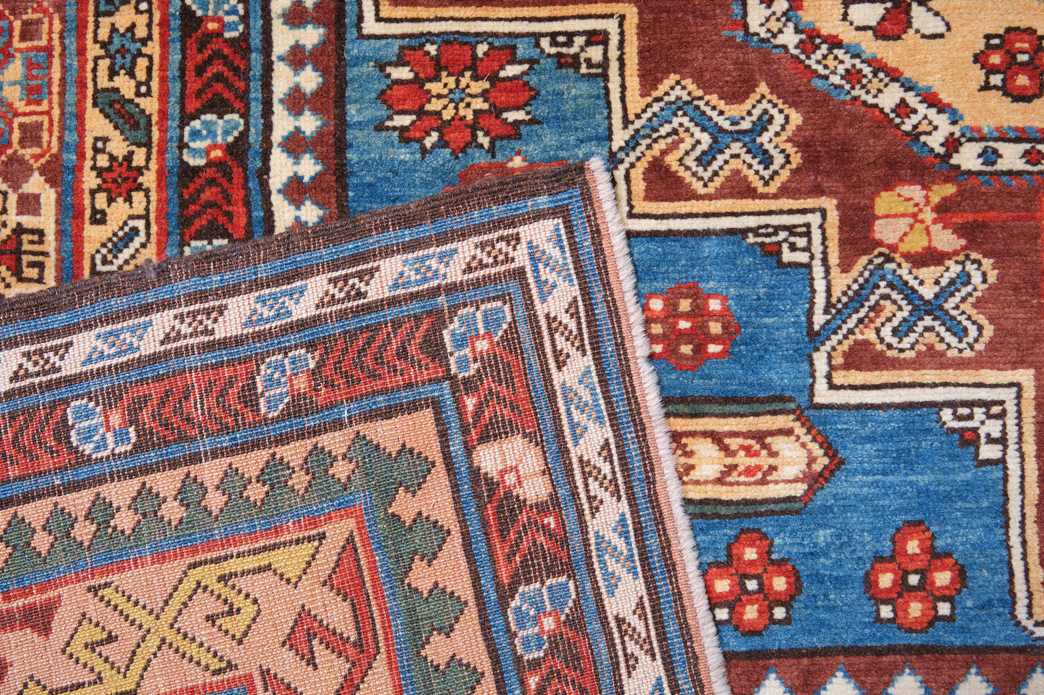 The source of the rug comes from the book Oriental Rugs Volume 1 Caucasian, Ian Bennett, Oriental Textile Press, Aberdeen 1993, nr.332. This is a spectacular example of the Konagkend type rug in the late 19th century in the Kuba region, Caucasus. There are three principal designs for rugs attributed to Konagkend ( Konakkent or Konakhend ). The first has a large cruciform medallion, the second, called by Kerimov and Schürmann 'Ordutch-Konagkend', has a series of large octagons, and the third, and probably best known, has a stiff, angular lattice based on hexagonal forms. Each type has a quite different aesthetic appeal and in each case, the design is reminiscent of other rugs. The cruciform medallion type usually has a bright, light palette and in both color and design is reminiscent of Kurdish weavings and certain Turkish village rugs. The 'Ordutch-Konagkend' pieces have strong affinities with Baku and other north Shirvan rugs, and the lattice type is the closest to the concept of design most normally associated with Kuba as well as having links with earlier groups of, principally Turkish, carpets. It is framed with a series of borders and the overall composition is quite closely related to a group of soumak rugs with large medallions. Our designers interpret the design of this rug and vivid colors are chosen for this rug.