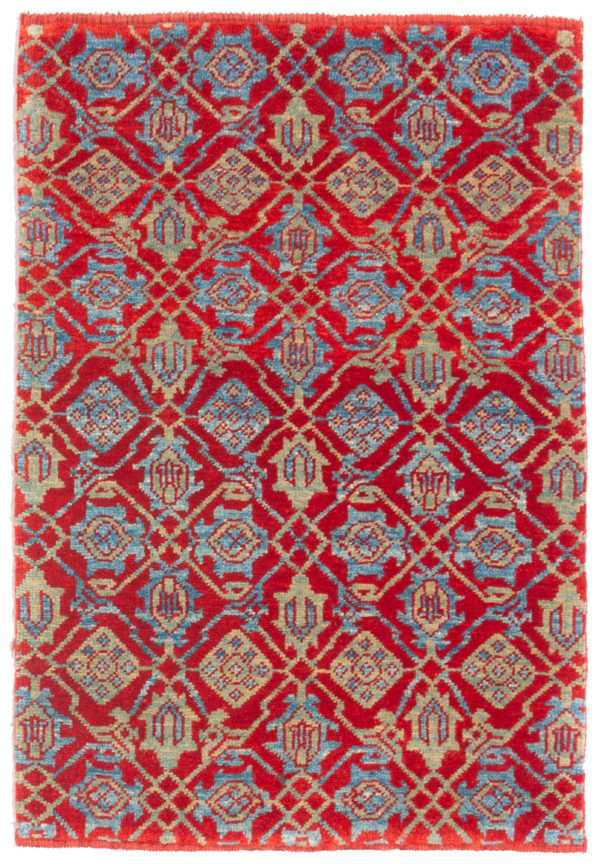 This lattice pattern is composed of palmettes and leaves filling the various compartments against the imposing ground. One has the impression that it is only part of a larger scheme designed 15th-century rug from the Mamluk era, Cairo region, Eygpt. These designs have often been described as wagirehs or samplers and were said to have been used as weaver`s aids, or for demonstration purposes, made as a template or pattern for the carpet design and production of larger rugs, they are generally small pieces the size of a scatter rug or mat. Mamluk carpets originated in a physical environment that lacked the combination of abundant marginal grazing land and a temperate climate with cool winters that were common to most carpet-weaving areas in the Islamic world. While related to a broader tradition of Turkish weaving centered in Anatolia, far to the north, the designs of these carpets include atypical elements, such as stylized papyrus plants, that are deeply rooted in Egyptian tradition. Their unusual composition and layout probably represent an attempt to develop a distinctive product that could in effect establish a โMamluk brandโ in the lucrative European export market. The uncharacteristic color schemeโdevoid of the undyed white pile and employing a limited range of three or five hues in much the same valueโalso suggests a conscious attempt to create a particular stylistic identity. Also virtually unique in the world of Islamic carpets is the S-spun wool. It has been argued that the tradition of clockwise wool spinning originated in Egypt because of the earlier Egyptian tradition of spinning flax into linen thread. Details of the plantโs botanical structure make it impossible to spin flax fiber in the more common counterclockwise direction utilized throughout the Middle East for wool and cotton.Mamluk carpets with the color combinations seen in the Simonetti are now generally accepted as part of an earlier tradition that has many links to the weaving of Anatolia, Iran, and Syria. The โthree-colorโ Mamluk carpets, well represented in the Metropolitanโs collection, represent a later development that continued well after the Ottoman conquest of Egypt in 1517. Many such carpets may have been produced well into the seventeenth century, and possibly even later. (Walter B. Denny in [Ekhtiar, Soucek, Canby, and Haidar 2011]). The design of the rug is interpreted by our designers from our Mamlouk-type rugs collection and vivid colors are used for this rug.