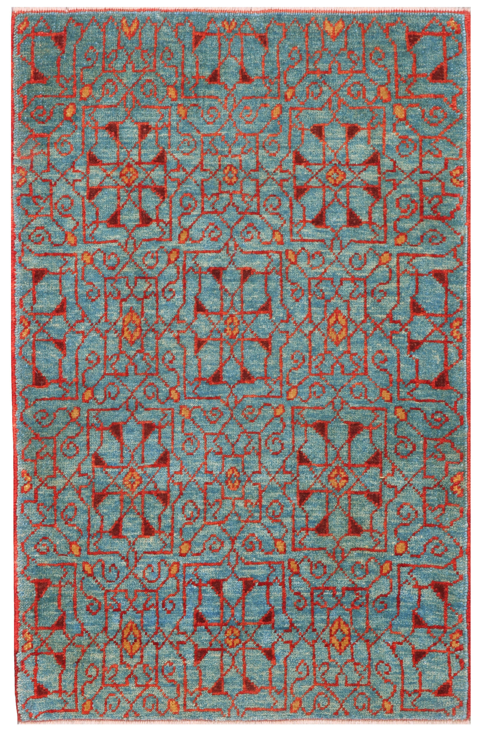 The source of the rug comes from the possession of Endre Unger, which was sold at Sotheby’s in 1992. That rug with the central star was designed in the early 16th-century rug by Mamluk Sultane of Cairo, Egypt. The interpreted design is composed of Jerrehian rug's border motifs lattice, covering the field elegantly. These kinds of rugs have often been described as wagirehs or samplers and were said to have been used as weaver`s aids, or for demonstration purposes, made as a template or pattern for the carpet design and production of larger rugs, they are generally small pieces the size of a scatter rug or mat.Mamluk carpets originated in a physical environment that lacked the combination of abundant marginal grazing land and a temperate climate with cool winters that were common to most carpet-weaving areas in the Islamic world. While related to a broader tradition of Turkish weaving centered in Anatolia, far to the north, the designs of these carpets include atypical elements, such as stylized papyrus plants, that are deeply rooted in Egyptian tradition. Their unusual composition and layout probably represent an attempt to develop a distinctive product that could in effect establish a “Mamluk brand” in the lucrative European export market. The uncharacteristic color scheme—devoid of the undyed white pile and employing a limited range of three or five hues in much the same value—also suggests a conscious attempt to create a particular stylistic identity. Also virtually unique in the world of Islamic carpets is the S-spun wool. It has been argued that the tradition of clockwise wool spinning originated in Egypt because of the earlier Egyptian tradition of spinning flax into linen thread. Details of the plant’s botanical structure make it impossible to spin flax fiber in the more common counterclockwise direction utilized throughout the Middle East for wool and cotton.Mamluk carpets with the color combinations seen in the Simonetti are now generally accepted as part of an earlier tradition that has many links to the weaving of Anatolia, Iran, and Syria. The “three-color” Mamluk carpets, well represented in the Metropolitan’s collection, represent a later development that continued well after the Ottoman conquest of Egypt in 1517. Many such carpets may have been produced well into the seventeenth century, and possibly even later. (Walter B. Denny in [Ekhtiar, Soucek, Canby, and Haidar 2011]). The design of the rug is interpreted by our designers from our Mamlouk-type rugs collection and soft colors are used for this rug.