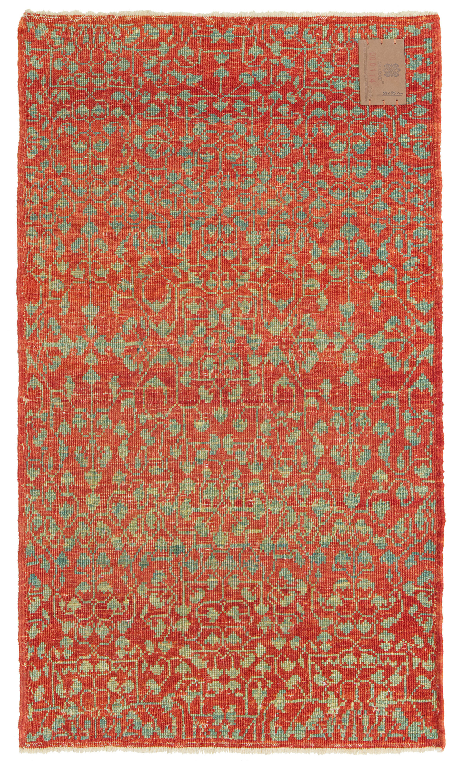 The source of carpet comes from the book Völker, Angela, Die orientalischen Knüpfteppiche das MAK, Vienna: Böhlau, 2001: 42–5. That rug with the central star was designed in the early 16th-century rug by Mamluk Sultane of Cairo, Egypt. It is exhibited at MAK – Museum of Applied Arts, Vienna Austria. The interpreted design is composed of a leaf lattice pattern taken from the border of the MAK Museum's rug, filling the field elegantly. These kinds of rugs have often been described as wagirehs or samplers and were said to have been used as weaver`s aids, or for demonstration purposes, made as a template or pattern for the carpet design and production of larger rugs, they are generally small pieces the size of a scatter rug or mat.Mamluk carpets originated in a physical environment that lacked the combination of abundant marginal grazing land and a temperate climate with cool winters that were common to most carpet-weaving areas in the Islamic world. While related to a broader tradition of Turkish weaving centered in Anatolia, far to the north, the designs of these carpets include atypical elements, such as stylized papyrus plants, that are deeply rooted in Egyptian tradition. Their unusual composition and layout probably represent an attempt to develop a distinctive product that could in effect establish a “Mamluk brand” in the lucrative European export market. The uncharacteristic color scheme—devoid of the undyed white pile and employing a limited range of three or five hues in much the same value—also suggests a conscious attempt to create a particular stylistic identity. Also virtually unique in the world of Islamic carpets is the S-spun wool. It has been argued that the tradition of clockwise wool spinning originated in Egypt because of the earlier Egyptian tradition of spinning flax into linen thread. Details of the plant’s botanical structure make it impossible to spin flax fiber in the more common counterclockwise direction utilized throughout the Middle East for wool and cotton.Mamluk carpets with the color combinations seen in the Simonetti are now generally accepted as part of an earlier tradition that has many links to the weaving of Anatolia, Iran, and Syria. The “three-color” Mamluk carpets, well represented in the Metropolitan’s collection, represent a later development that continued well after the Ottoman conquest of Egypt in 1517. Many such carpets may have been produced well into the seventeenth century, and possibly even later. (Walter B. Denny in [Ekhtiar, Soucek, Canby, and Haidar 2011]). The design of the rug is interpreted by our designers from our Mamlouk-type rugs collection and soft colors are used for this rug.