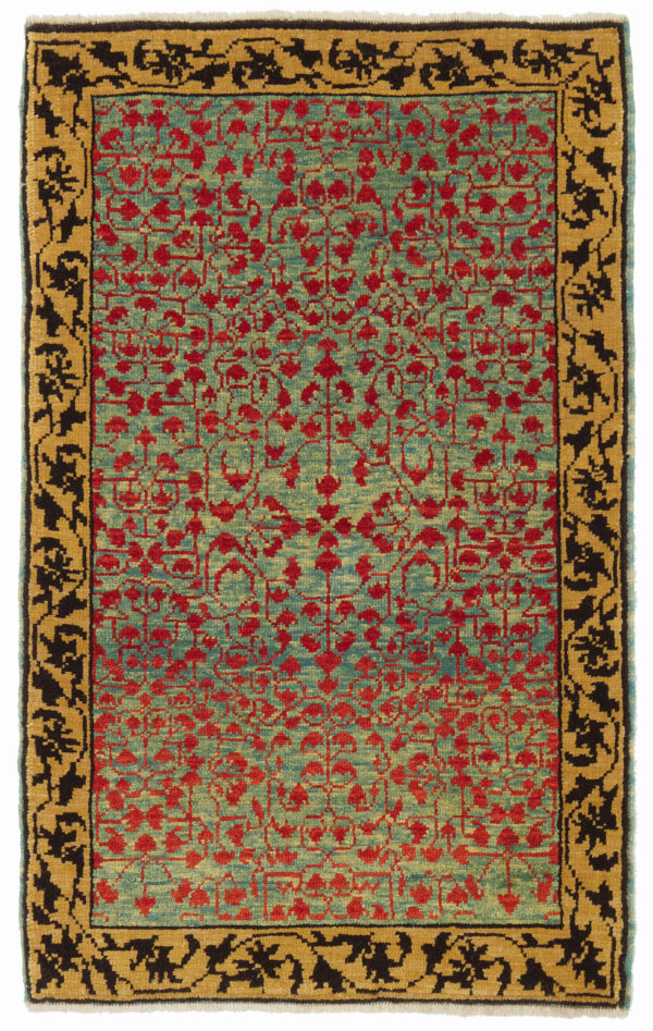 The source of carpet comes from the book Völker, Angela, Die orientalischen Knüpfteppiche das MAK, Vienna: Böhlau, 2001: 42–5. That rug with the central star was designed in the early 16th-century rug by Mamluk Sultane of Cairo, Egypt. It is exhibited at MAK – Museum of Applied Arts, Vienna Austria. The interpreted design is composed of a leaf lattice pattern taken from the border of the MAK Museum's rug, filling the field elegantly. These kinds of rugs have often been described as wagirehs or samplers and were said to have been used as weaver`s aids, or for demonstration purposes, made as a template or pattern for the carpet design and production of larger rugs, they are generally small pieces the size of a scatter rug or mat.Mamluk carpets originated in a physical environment that lacked the combination of abundant marginal grazing land and a temperate climate with cool winters that were common to most carpet-weaving areas in the Islamic world. While related to a broader tradition of Turkish weaving centered in Anatolia, far to the north, the designs of these carpets include atypical elements, such as stylized papyrus plants, that are deeply rooted in Egyptian tradition. Their unusual composition and layout probably represent an attempt to develop a distinctive product that could in effect establish a “Mamluk brand” in the lucrative European export market. The uncharacteristic color scheme—devoid of the undyed white pile and employing a limited range of three or five hues in much the same value—also suggests a conscious attempt to create a particular stylistic identity. Also virtually unique in the world of Islamic carpets is the S-spun wool. It has been argued that the tradition of clockwise wool spinning originated in Egypt because of the earlier Egyptian tradition of spinning flax into linen thread. Details of the plant’s botanical structure make it impossible to spin flax fiber in the more common counterclockwise direction utilized throughout the Middle East for wool and cotton.Mamluk carpets with the color combinations seen in the Simonetti are now generally accepted as part of an earlier tradition that has many links to the weaving of Anatolia, Iran, and Syria. The “three-color” Mamluk carpets, well represented in the Metropolitan’s collection, represent a later development that continued well after the Ottoman conquest of Egypt in 1517. Many such carpets may have been produced well into the seventeenth century, and possibly even later. (Walter B. Denny in [Ekhtiar, Soucek, Canby, and Haidar 2011]). The design of the rug is interpreted by our designers from our Mamlouk-type rugs collection and soft colors are used for this rug.