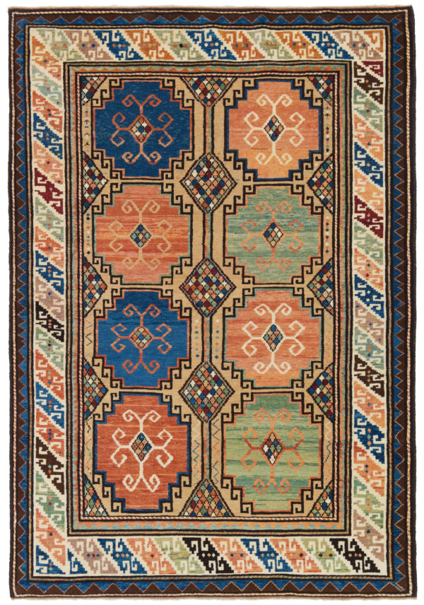 The source of the rug comes from the book Tapis du Caucase - Rugs of the Caucasus, Ian Bennett & Aziz Bassoul, The Nicholas Sursock Museum, Beirut, Lebanon 2003, nr.24 and Oriental Rugs Volume 1 Caucasian, Ian Bennett, Oriental Textile Press, Aberdeen 1993, nr.68 and Caucasian Carpets, E. Gans-Reudin, Thames and Hudson, Switzerland 1986, pg.118. This is a famous, and ubiquitous, design of hooked polygons with crosses (called 'Memling ( Memlinc ) gül') from the late 19th century, Kazak region, Caucasus area. It is often difficult to distinguish between rugs woven in the Kazak, Karabakh, Genje, and Moghan districts. Rugs with rows of stepped and hooked rectangles within octagons (the so-called "Memling gül" named after the 15th-century Flemish artist Hans Memling, in some of whose paintings such rugs are depicted) are often attributed without clear evidence to Moghan. As well as in many other Caucasian areas, pieces of this design were also woven in Anatolia, and it is generally assumed that the rugs which appear in Memling's paintings, and those in the works of another 15th and 16th century Flemish and Italian painters, were probably Turkish rather than Caucasian. This theory, however, remains unproven. This is a medallion design with "Memling güls". The "güls", consisting of eight-stepped hooked octagons enclosing a rhombus bearing of large curved hooks in a cruciform arrangement, are a design typically found in rugs of the Moghan district. The design of this rug is interpreted and the most appropriate colors to match the original are used for this rug.
