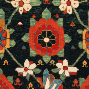 The source of the rug comes from the book Antique Rugs of Kurdistan A Historical Legacy of Woven Art, James D. Burns, 2002 nr.4. This was an exclusive example of a Mina Khani lattice design mid-19th century rug from Koliya'i, Southern Kurdistan area. The mina khani is composed of a series of rows of aster flowers surrounded by circular tendrils, vines, and other flowers; it's used in many areas of southern and eastern Kurdistan and is among the most popular of all Kurdish patterns. This is a typically tribal and primitive treatment of an ancient pattern of linked flowers with three narrow borders of roughly equal width. The design of this rug is interpreted and soft colors are chosen for this rug.