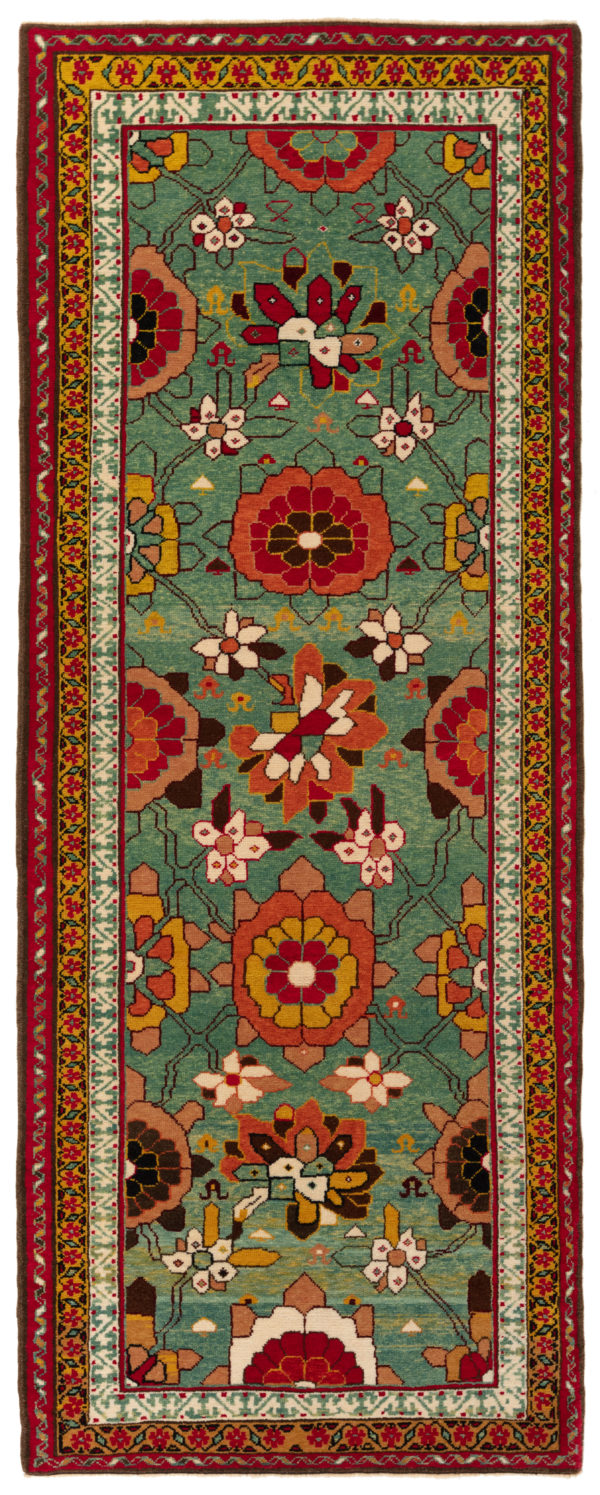The source of the rug comes from the book Antique Rugs of Kurdistan A Historical Legacy of Woven Art, James D. Burns, 2002 nr.4. This was an exclusive example of a Mina Khani lattice design mid-19th century rug from Koliya'i, Southern Kurdistan area. The mina khani is composed of a series of rows of aster flowers surrounded by circular tendrils, vines, and other flowers; it's used in many areas of southern and eastern Kurdistan and is among the most popular of all Kurdish patterns. This is a typically tribal and primitive treatment of an ancient pattern of linked flowers with three narrow borders of roughly equal width. Our designers interpret the design of this rug and vivid colors are chosen for this rug.
