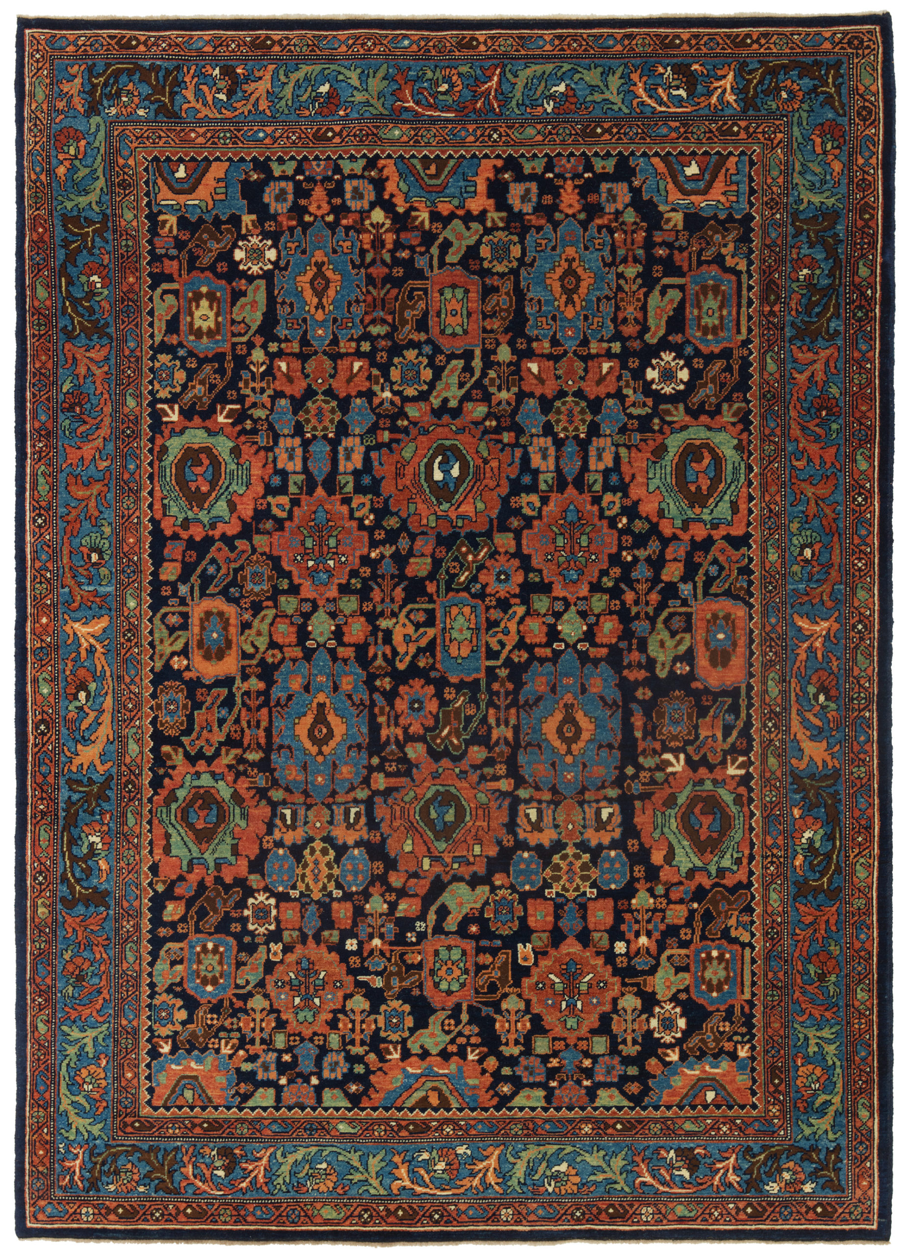 This offset pattern is composed of palmettes and flowers, one has the impression that it is only part of a larger scheme designed 19th-century rug from the Bidjar region, Eastern Kurdistan area. Very similar palmettes, drawn in a curvilinear manner and combined with identical forked leaves, can be seen on a few examples of workshop carpets made from the late seventeenth century onward in Herat in Khurasan province, east Persia, and the same pattern known as Harshang design was used in the Caucasus in the eighteenth century, as well. The design employs floral, richly complex repeating arrays of brilliant color palmettes and flowers that mark it as a lineal descendant of the great vase-technique carpets of the seventeenth century.Kurdistan has not usually been given it's due as a region that has produced rugs of considerable excellence in design and rich brilliant colors, probably from early times on, well into the 19th century. Technically they range from the solid, heavy, double-warped Bijars of the 19th century to the flexible rug of this type, and the Kilims, or flat-woven rugs of great delicacy. The design displayed in this example, clearly derived from a 17th-century model, proved so popular that it spread not only to Eastern Persia but to the Caucasus as well. It continues well into the 18th century and can still be found in Caucasian rugs of the 19th century. The design of this rug is based on an alternating succession of two large lateral palmettes surrounded by small palmette blossoms, a complex palmette arrangement composed of a central round floral medallion, four large palmette forms of two different designs facing this rosette, and four diamond-shaped cartouches, filled with rosettes, on the diagonal axis. A small-scaled trellis system fills, as a secondary pattern, most of the background of the field. The border design follows a well-established tradition of the cartouche and star medallion succession. Both guard stripes are filled with a lively angular leafy meander scroll. The lattice appears to continue into infinity – as though we can see the section that is framed by the characteristic Bidjar border. The design of the rug is interpreted by our designers, and vivid colors are chosen for this rug.