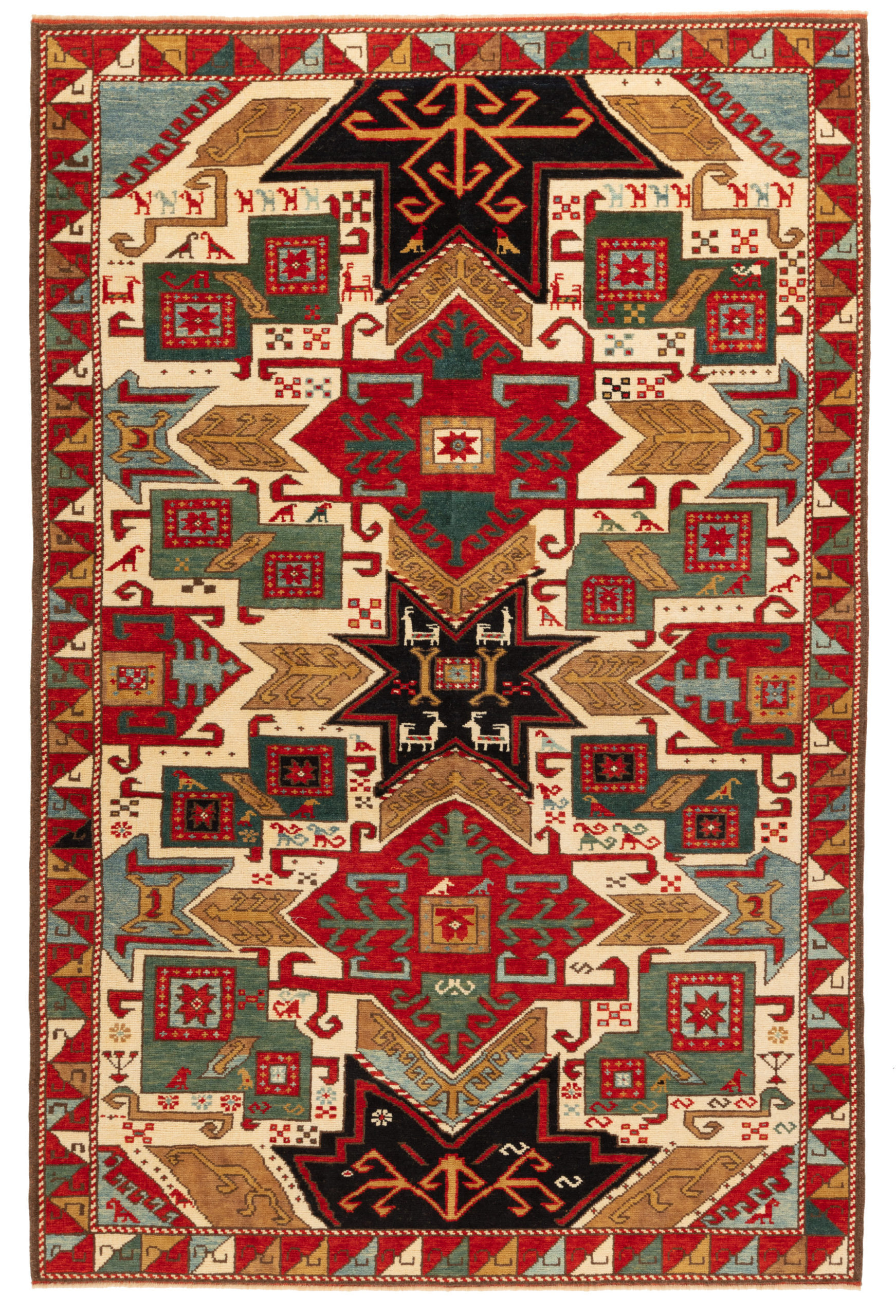 The source of the rug comes from the book Orient Star - A Carpet Collection, E. Heinrich Kirchheim, Hali Publications Ltd, 1993 nr.1. This is supposed to represent the most 'authentic' version of the Star Kazaks design rug from the early 19th century from the Central Caucasus area. Star Kazak rugs are considered to be the most desirable of all post-classical Caucasian types and are much in demand among collectors. Within the wider group, this piece is supposed to represent the most 'authentic' version of the design, although this rug clearly does not come from the Kazak region of the central Caucasus, but from further south and east. The appearance of this rug is very regular and geometric. Star Kazaks are usually called in English 'star' Kazak and the second 'swastika', although its interlocking design can be interpreted as a version of the star; some of the second types have the swastika motifs standing in greater isolation on a less busy field. However, as with descriptions of Oriental carpet designs generally, the term 'swastika' is more one of convenience than reality; pieces of this design can often be found described in the literature as either 'eternity symbol' Kazaks or 'pinwheel' Kazaks. The design of the rug is interpreted by our designers, the most appropriate colors to match the original is used for this rug.