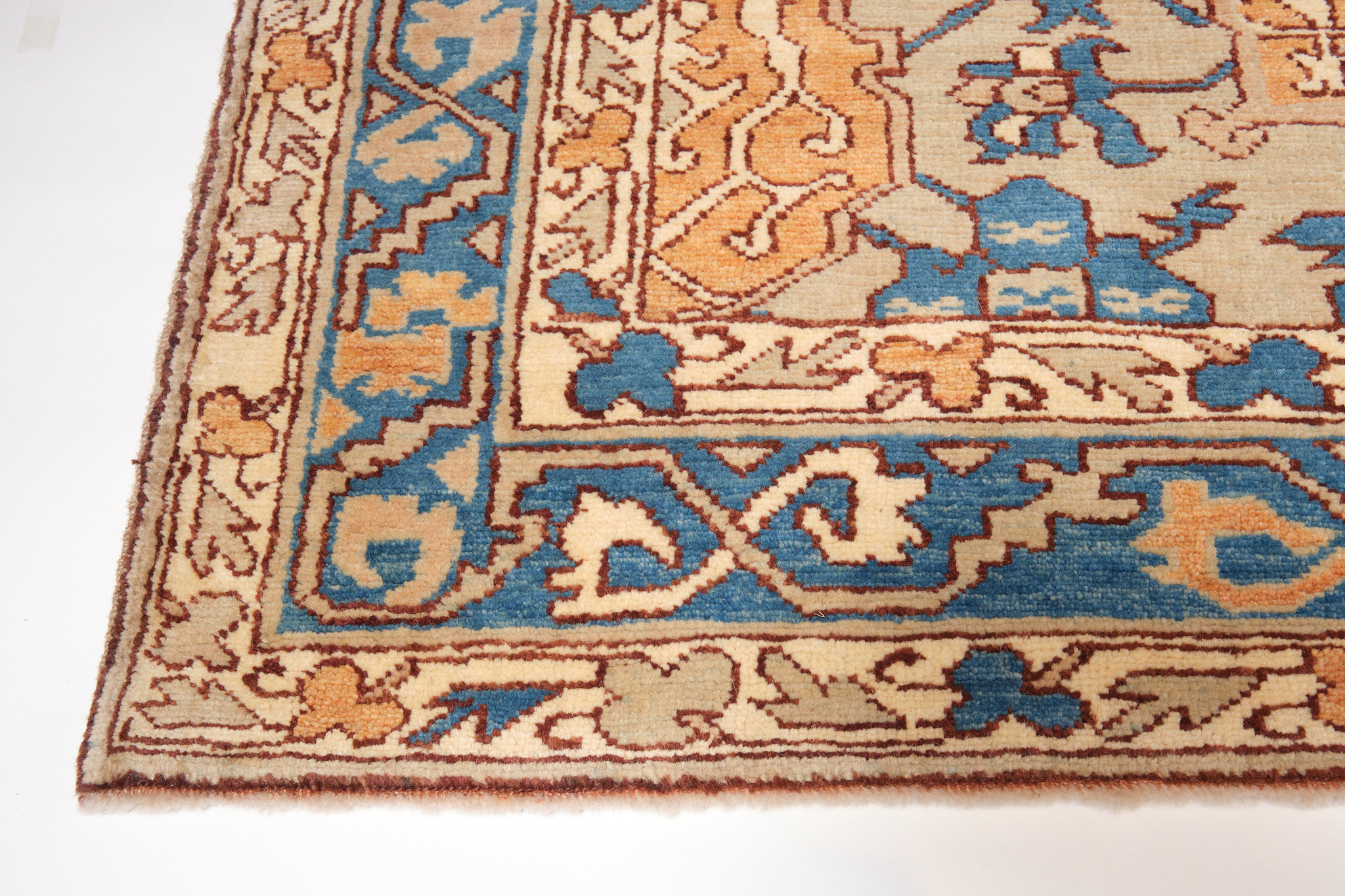 The source of the carpet comes from the book How to Read – Islamic Carpets, Walter B. Denny, The Metropolitan Museum of Art, New York 2014 fig.46-47 and Oriental Rugs, Volume 4 Turkish, Kurt Zipper and Claudia Fritzsche, Antique Collectors' Club, 1989 nr.82. This 16th-century deeply serrated eight-lobbed starlike medallion rug is from central Anatolia. Similar designs are exhibited at various museums. The town of Ushak, north of Denizli, is probably one of the most important and renowned carpet centers. Carpets have survived from the 16th century and can be seen in several museums. In the 17th century great quantities of Ushak carpets were made for the royal houses of Europe, often incorporating crests; many Christian churches, not only in Transylvania, were often decorated with very large pieces. According to their structure and patterning, there are several types of Ushak carpets: the star Ushak, the medallion Ushak, the 'bird' carpet (with a white background, the name relates to the shapes of the field motifs), and 'Chintamani' carpets (often with a white background and three-ball pattern, mostly in connection with cloud bands). Many great painters have ensured the survival of Ushak carpet designs by including them in their works. Two representatives of the Ushak group take their name from such renowned artists: pieces with plaited band medallions in several variations are named 'Holbein' carpets after Hans Holbein, the younger; 'Lotto' carpets refer to the painter Lorenzo Lotto. Beautiful old Ushak carpets are rare and seldom appear in the trade. The design of the carpet is interpreted by our designers with two medallions, and soft colors are used for this carpet.