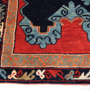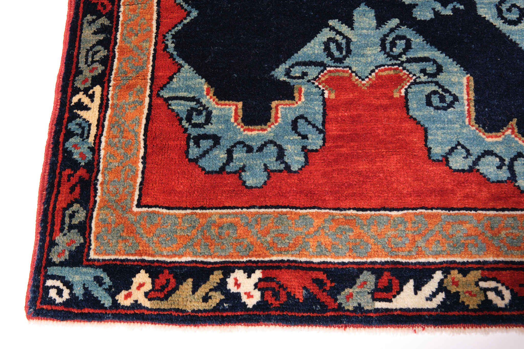 The source of the rug comes from the book Orient Stars Collection, Anatolian Tribal Rugs 1050-1750, Michael Franses, Hali Publications Ltd, 2021 fig.189 and Antique Rugs from the Near East, Wilhelm von Bode and Ernst Kühnel, Klinkhardt & Biermann, Berlin 1958, pg.49 and Oriental Rugs, Volume 4 Turkish, Kurt Zipper and Claudia Fritzsche, Antique Collectors' Club, 1989 nr.86. This 15th-century rug is from central Anatolia, circa 1500-1550. It is exhibited at the Museum of Islamic Art, Berlin, inv. no I.24. This rug is among the most famous in the Berlin collection. As early as 1871 it was acquired by Wilhelm von Bode for the painter Heinrich von Angeli, but it was not until 1905 that Bode was able to buy it from his heirs and donate it to the Museum. Von Angeli and some of his colleagues depicted this rug several times. The charm of this rug lies in its depth of color, high, dense pile, and the impressive sheen of the wool. On a dark blue ground, two red-ground spandrels are separated in the form of niches by a strong white line. Unusually, the spandrels blend into each other at their tops. The lower half of the niche field is filled with a light blue cloud band, in whose arc a large blossom forms a fixed point. This cloud band is reminiscent of delimitations in the so-called keyhole or Bellini carpets. Their angular arch forms are often associated with fountains, which were needed for the ritual cleansing before prayer. Because of the Persian appearance of the blossoms, the origin of the cloud band from East Asian cultures, and the use of depressed warps, this rug has occasionally been ascribed to Persia. However, not only the color palette and the reference to the keyhole motif, but also the use of a symmetrical knot, speak in favor of a location in Turkey. The most appropriate colors to match the original is used for this rug.Source: Museum of Islamic Art at the Pergamon Museum
